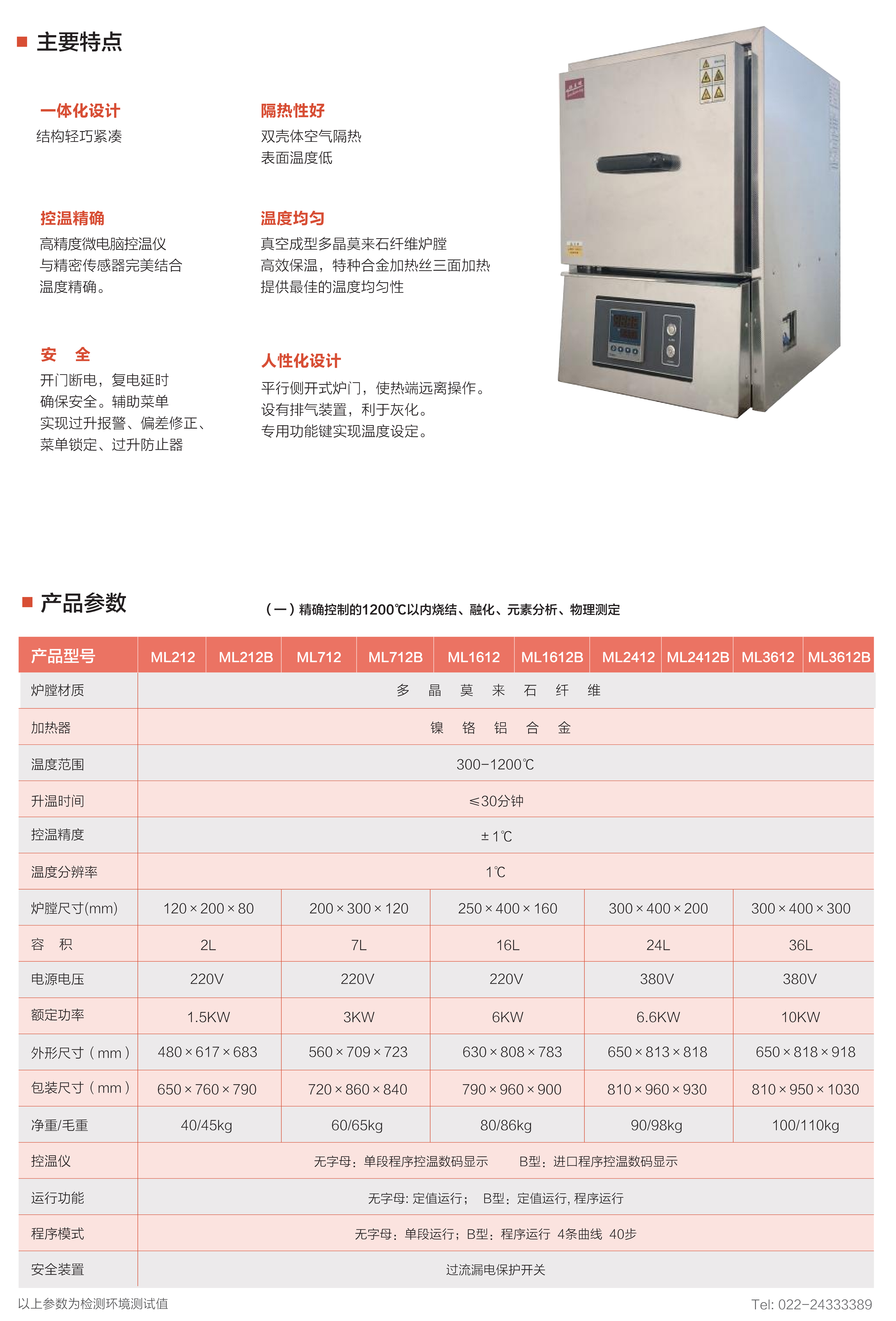 结构轻巧紧凑,双壳体空气隔热,表面温度低。高精度微电脑控温仪与精密传感器完美结合温度精确。开门断电,复电延时确保安全。辅助菜单实现过升报警、偏差修正、菜单锁定、过升防止器。真空成型多晶莫来石纤维炉膛高效保温,特种合金加热丝三面加热提供最佳的温度均匀性。平行侧开式炉门,使热端远离操作。设有排气装置,利于灰化专用功能键实现温度设定。