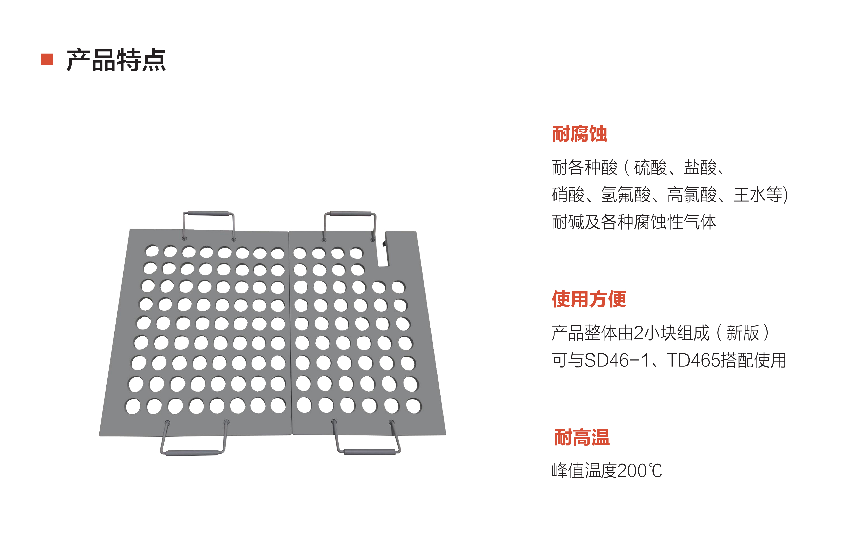 耐各种酸(硫酸、盐酸、硝酸、氢氟酸、高氯酸、王水等)耐碱及各种腐蚀性气体,产品整体由2小块组成(新版可与SD46-1、TD465搭配使用,峰值温度200C。